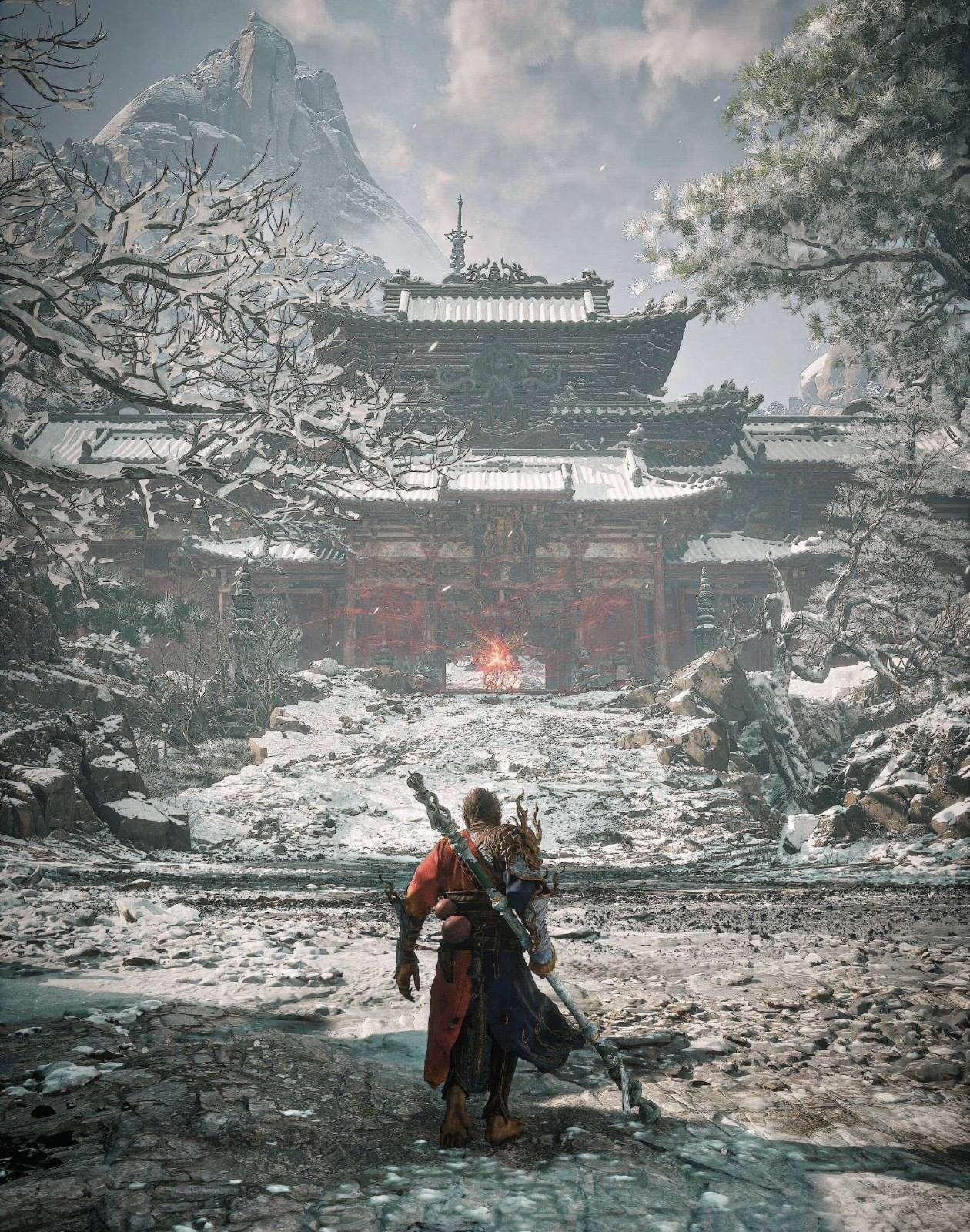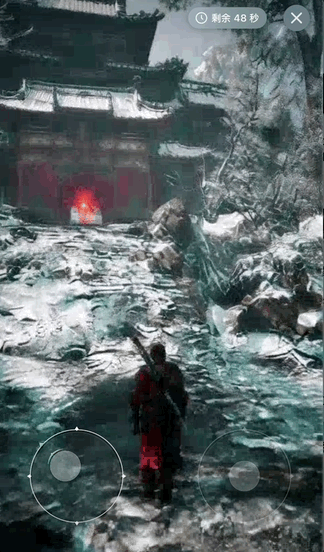 当我上传《黑神话:悟空》中的小雷音寺场景图片,灵光迅速生成了以下与游戏界面类似的“世界”。画面中引入了手游摇杆操控,据称这是灵光针对动端操作习惯一个创新点。如下图所示,通过遥感操纵,我能以悟空的第一视角向前。