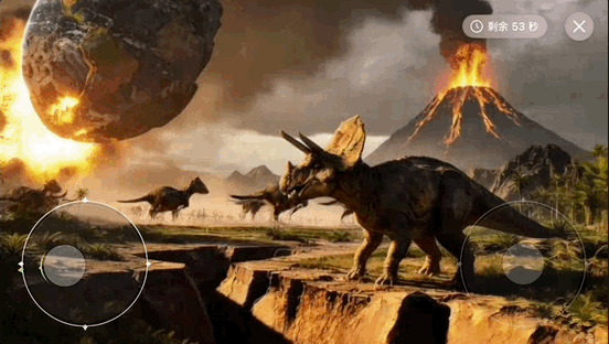最后我又拿一张恐龙灭绝主题的CG艺术图来尝试,只见陨石坠落、火山远景都刻画得富有动态,但陨石悬浮时间有些久;远处陨石、浓烟边界清晰,没有被简化为单一色块;恐龙在走动中及重叠时形态没有严重畸变,整体表现没有大的视觉Bug。