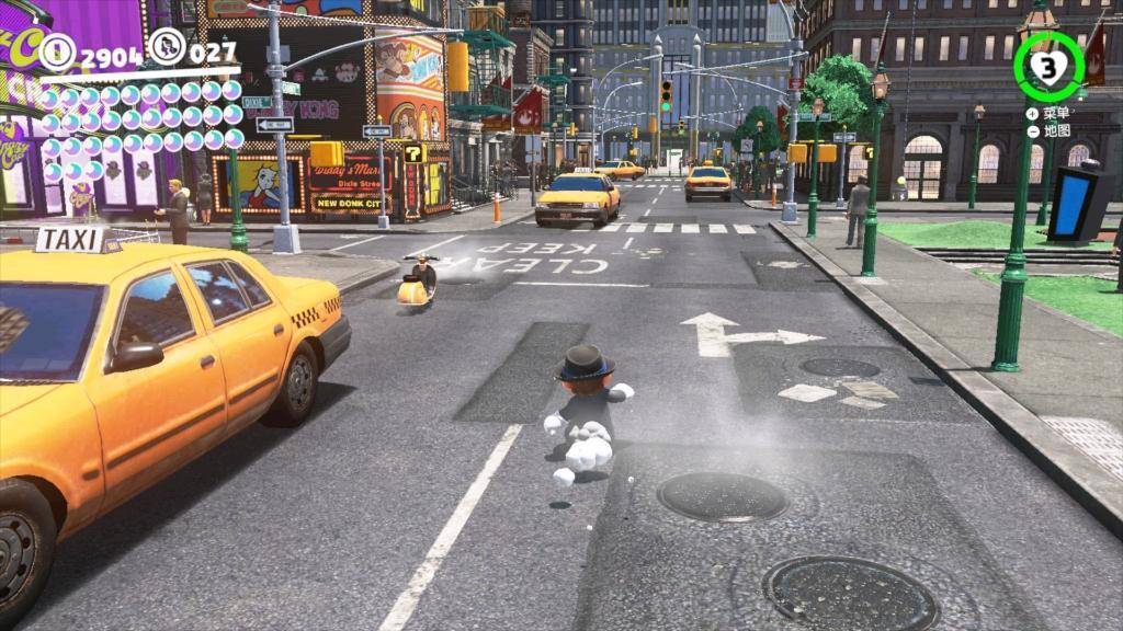 再看看《超级马里奥:奥德赛》都市国街道场景生成情况,路侧的近景路灯、中景行人行道、远景高楼显得比较有层次,没有明显的粘连;角色沿街道直线行走时,两侧建筑保持平行,透视正确;但地上的斑马线出现了一些扭曲,小摩托“自动驾驶”后消失,略显不足;随着游览速度加快,图像的清晰度有些打折扣,马里奥的身形已不太清楚。