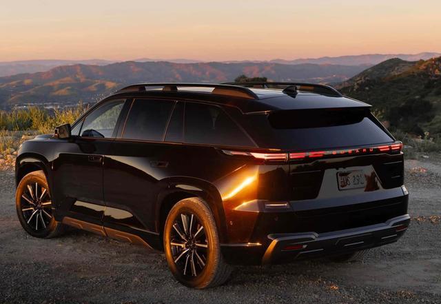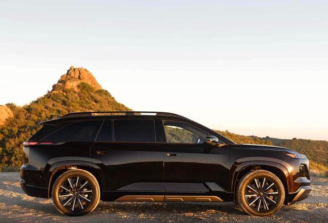 来到车身侧面,斯巴鲁Getaway车身加入了大量锋利的线条勾勒,车顶配备了黑色的全尺寸行李架,黑色的A/B/C/D柱与全黑色的隐私玻璃巧妙的结合在了一起,凌厉的肩线横向贯穿了整个车身,内凹的车门型面让庞大的车身也有迷人的腰线,外凸式的轮眉下方配备了19英寸/20英寸的多辐式铝合金双色切削铝圈轮毂,与之匹配了全地形或城市SUV专用轮胎,兼顾公路舒适性与轻度非铺装路面能力。尺寸方面,斯巴鲁Getaway长宽高为5050/1989/1709mm,轴距为3051mm,与丰田纯电汉兰达几乎保持一致。两车也互为姊妹车型。车内采用了3排7座布局,后两排座椅可以按比例放倒,形成一个巨大的后备厢,能适应更多的户外应用场景。