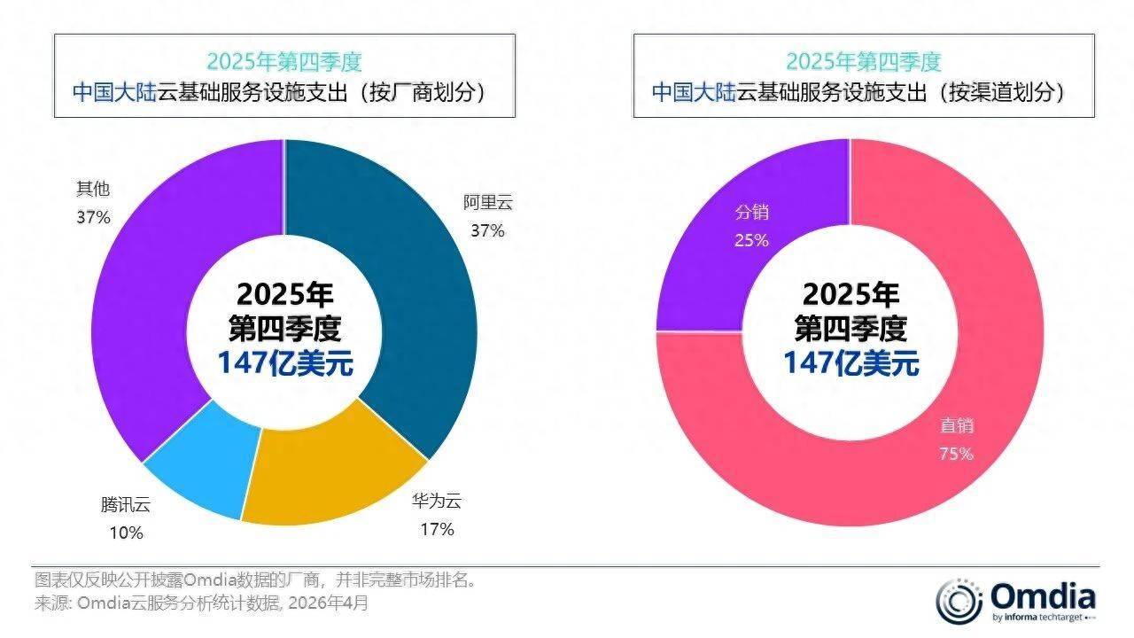 DoNews4月27日消息,Omdia最新研究,2025年第四季度,中国大陆云基础设施服务支出达到147亿美元,同比增长26%。市场增速较上一季度进一步加快,并已连续第三个季度保持20%以上增长。Omdia预测,2026年中国云基础设施服务支出仍将实现26%的增长。